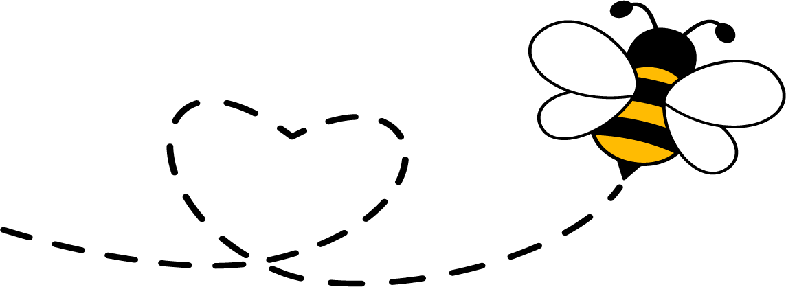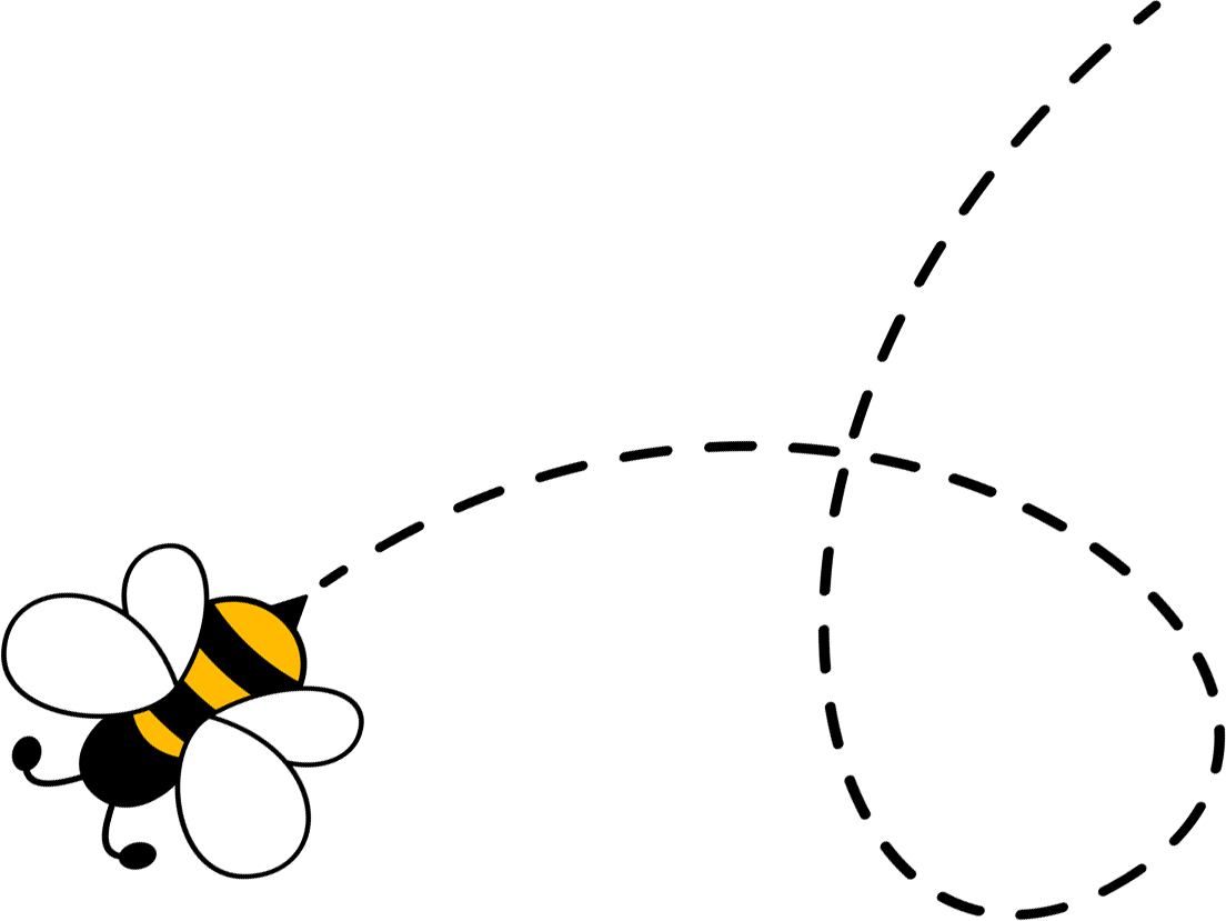 Cartoon bee with yellow and black stripes, smiling, flying, and has small blue wings.